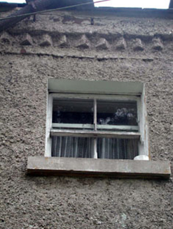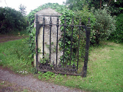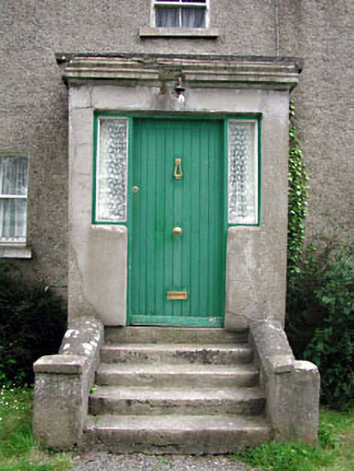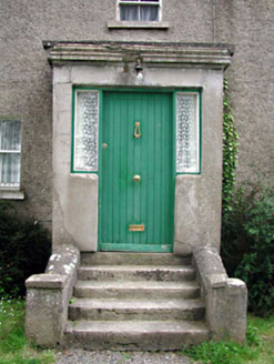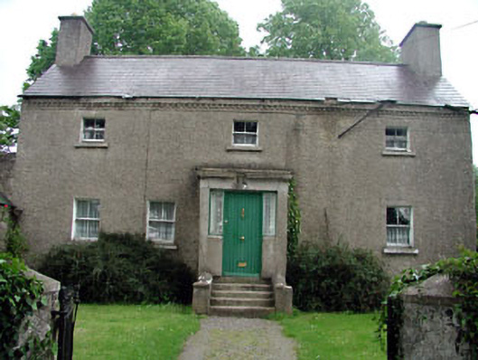 Detached three-bay two-storey house, c.1800, possibly over basement retaining early aspect with single-bay single-storey flat-roofed projecting porch to centre approached by flight of steps. Gable-ended roof with slate. Clay ridge tiles. Rendered chimney stacks. Remains of cast-iron rainwater goods. Flat-roofed to porch behind blocking course. Materials not visible. Roughcast walls. Unpainted. Dentilated stringcourse to eaves. Moulded cornice to blocking course to porch. Square-headed window openings (one possibly additional to left ground floor). Stone sills. 2/2 timber sash windows. Square-headed door opening approached by flight of four steps. Tongue-and-groove timber panelled door. Sidelights. Set back from road in own grounds. Lawns and gravel path to forecourt. Gateway, c.1800, to west comprising pair of roughcast circular piers with cut-stone capping having cast-iron double gates.