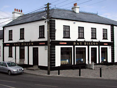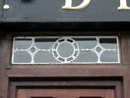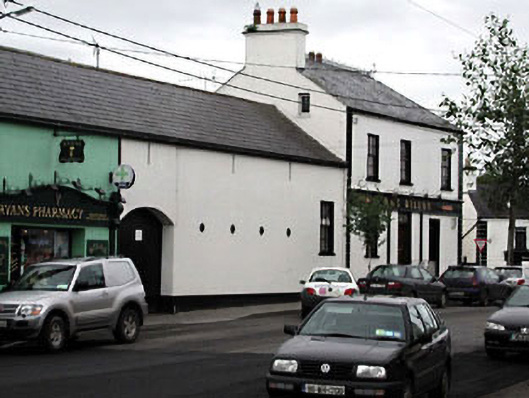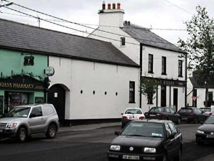 Terraced four-bay two-storey house, c.1800, on an L-shaped plan on a corner site with three-bay side elevation to north-west. Extensively renovated, c.1980, with openings remodelled to ground floor to accommodate commercial use having fascia over. Hipped and gable-ended roof on an L-shaped plan. Replacement artificial slate, c.1980. Decorative iron ridge tiles. Rendered chimney stacks. Rendered coping to gable. Cast-iron rainwater goods on rendered eaves course. Rendered walls. Painted. Channelled piers to corners. Square-headed openings (remodelled, c.1980, to ground floor). Stone sills (replacement concrete sills, c.1980, to ground floor). Replacement timber casement windows, c.1980. Replacement fixed-pane timber windows, c.1980, to ground floor with replacement glazed timber panelled door, c.1980, having overlight. Timber fascia, c.1980, over openings to ground floor on both elevations supported by timber pilasters. Square-headed door opening to side elevation to north-west approached by flight of steps. Replacement timber panelled door, c.1980. Decorative overlight. Road fronted on a corner site. Concrete brick cobbled footpath to front. Attached three-bay two-storey outbuilding with half-attic, c.1800, to north-east with segmental-headed integral carriageway. Reroofed and renovated, c.1980, with additional window opening inserted. Gable-ended roof (shared with building to north-east). Replacement artificial slate, c.1980. Concrete ridge tiles. Replacement aluminium rainwater goods on eaves course. Rendered walls. Painted. Iron tie plates. Square-headed slit-style window openings. No sills. Square-headed window opening, c.1980, to right with concrete sill and timber casement window. Segmental-headed integral carriageway to left. Timber boarded doors with timber overpanel.