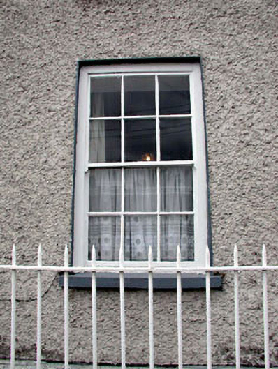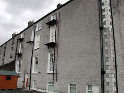 End-of-terrace four-bay three-storey over basement house, c.1770, possibly originally detached retaining early fenestration with round-headed door opening to right approached by flight of steps and four-storey rear elevation to south-west. Reroofed, c.1970, with openings remodelled to basement level to rear (south-west) elevation. Gable-ended roof. Replacement artificial slate, c.1970. Clay ridge tiles. Rendered chimney stacks. Replacement uPVC rainwater goods, c.1990. Roughcast walls. Unpainted. Rendered quoins to corners. Rubble stone walls to basement with limewash over. Square-headed window openings (remodelled, c.1970, to basement level to rear (south-west) elevation). Stone sills (concrete, c.1970, to remodelled openings). 3/3 and 6/6 timber sash windows with exposed sash boxes (replacement timber casement windows, c.1970, to remodelled openings). Round-headed door opening to right ground floor approached by flight of steps. Cut-stone Gibbsian doorcase with moulded lintel and keystone. Timber panelled door. Spoked fanlight. Fixed-pane sidelights forming Venetian arrangement. Set back from line of road. Section of wrought iron railings to basement on red brick plinth. Tarmacadam verge to front.