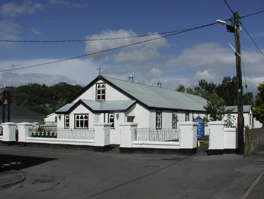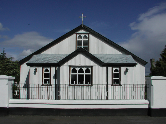 Detached eight-bay single-storey Catholic church, built 1923-4; opened 1924, on a rectangular plan comprising seven-bay single-storey nave opening into single-bay single-storey chancel (east); three-bay single-storey lean-to porch to entrance (west) front centred on single-bay single-storey gabled breakfront. Refenestrated, ----. Pitched corrugated-iron roof; lean-to corrugated-iron roof (porch) centred on pitched (gabled) corrugated-iron roof (breakfront), pressed iron ridge centred on cone-topped vents, timber bargeboards to gables with Cross finials to apex, and replacement uPVC rainwater goods on timber eaves boards retaining cast-iron downpipes. Corrugated-iron-covered walls on mass concrete plinth. Square-headed window openings with timber sills, and timber surrounds framing replacement uPVC casement windows replacing timber casement windows. Pointed-arch window opening (east) with timber sill, and timber surround framing fixed-pane fittings having leaded stained glass panels. Square-headed window openings (porch) centred on square-headed window opening (breakfront), timber sills, and timber surrounds framing replacement uPVC casement windows replacing timber casement windows. Square-headed opposing door openings ("cheeks") with concrete steps, and timber surrounds framing timber boarded doors. Interior including vestibule (west); square-headed door opening into nave with glazed timber panelled double doors; full-height interior open into roof reordered with timber boarded walls, carpeted central aisle between timber pews, exposed collared roof construction with timber boarded ceiling, and Tudor-headed chancel arch framing carpeted stepped dais to sanctuary (east) with timber panelled altar below stained glass memorial "East Window" (----). Set in landscaped grounds with rendered chamfered piers to perimeter having shallow pyramidal capping supporting iron railing.