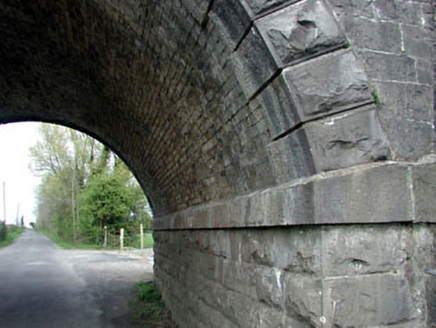 Single-arch dressed stone railway bridge over road, c.1870, with rock-faced granite voussoirs and dressed stone coping. Renovated, c.1990. Coursed dressed stone walls. Cut-stone stringcourse to spring of arch. Cast-iron tie plates. Cut-stone coping. Replacement concrete block, c.1990, to parapet walls with replacement iron railings over. Single round arch with rock-faced voussoirs and yellow brick soffits. Sited spanning road as part of Great Southern and Western Railway line.