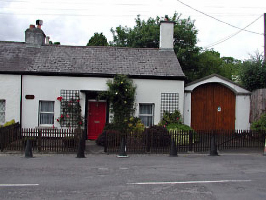 End-of-terrace three-bay single-storey house with half-dormer attic, c.1800, with render pilaster doorcase having consoles with canopy over. Extensively renovated, c.1960. Refenestrated, c.1990. Gable-ended roof (shared to south-west). Replacement artificial slate, c.1960. Concrete ridge tiles. Rendered chimney stack. Metal rainwater goods. Replacement rendered walls, c.1960. Painted. Square-headed openings. Stone sills. Replacement uPVC casement windows, c.1990. Render doorcase with pilasters, consoles and canopy over. Timber panelled door. Diamond-leaded overlight. Set back from line of road. Tarmacadam forecourt to front with timber fence to boundary. Gateway, c.1800, to north-east comprising pair of rendered piers with elliptical-headed carriageway having gable over with cut-stone dressings forming 'pediment’. Replacement timber boarded gates, c.1990.