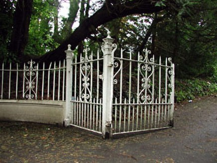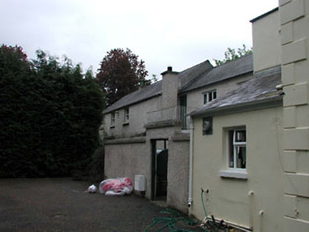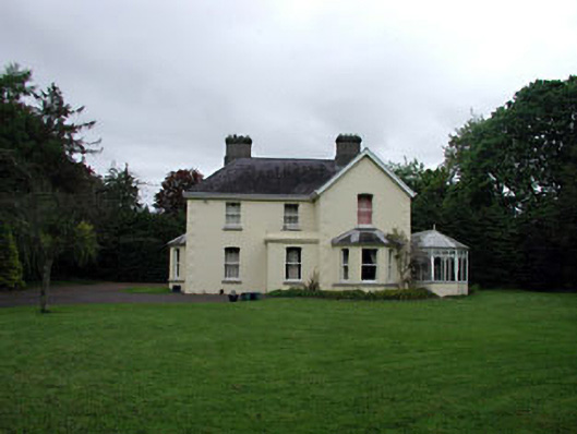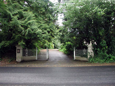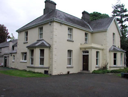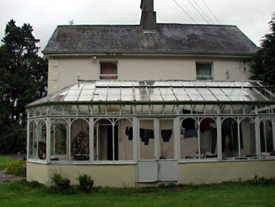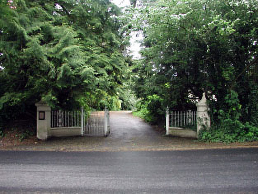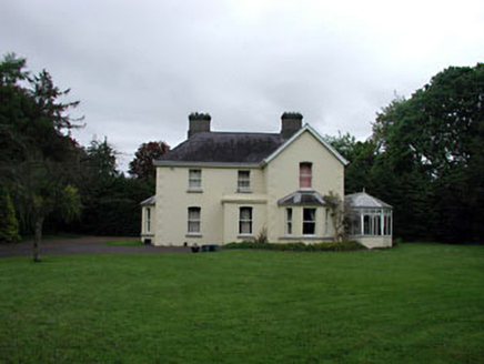 Detached three-bay two-storey house, c.1890, on an irregular plan retaining original aspect with single-bay single-storey flat-roofed advanced porch to front, single-bay two-storey gabled projecting end bay to right (south-east) having single-bay single-storey canted bay window to ground floor, two-bay two-storey side elevation to north-west having single-bay single-storey canted bay window to ground floor and two-bay two-storey side elevation to south-east having two-bay single-storey conservatory. Hipped roof with slate (gabled to projecting end bay). Clay ridge tiles. Rendered chimney stacks. Timber eaves and bargeboards. Cast-iron rainwater goods. Flat-roof to porch behind parapet wall. Materials not visible. Hipped roof to conservatory. Glazed in timber frame. Rendered walls. Painted. Rendered quoins to corners. Rendered stringcourse to porch with blocking course over to parapet wall. Square-headed window openings (one shallow segmental-headed to ground floor). Stone sills. 1/1 timber sash windows (with one replacement timber casement windows, c.1970, to side elevation to north-west). Fixed-pane timber windows to conservatory with paired round-headed frames having overlights. Shallow segmental-headed door opening to porch. Timber panelled door. Overlight. Glazed timber double doors to conservatory. Set back from road in own landscaped grounds. Attached four-bay two-storey former outbuilding, c.1890, to north-east with two-bay single-storey lower linking bay to south-west. Extensively renovated, c.1970, to accommodate residential use. Gable-ended roofs with slate. Clay ridge tiles. Iron vent to apex with conical capping. Cast-iron rainwater goods. Roughcast walls. Unpainted. Square-headed window openings. Stone sills (concrete sills to remodelled openings). Early 1/1 timber sash windows (replacement timber casement windows, c.1970, to remodelled openings). Gateway, c.1890, to south comprising cast-iron piers with cast-iron double gates having cast-iron flanking pedestrian gate to west and curved flanking plinth walls with iron railings over having rendered terminating piers with ogee moulded capping.