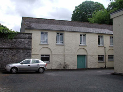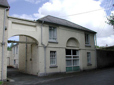 Detached three-bay two-storey former coach house, c.1800, on an L-shaped plan retaining some early fenestration originally with round-headed integral carriageway to centre and five-bay two-storey return to rear to north-east originally with series of three round-headed integral carriageways to ground floor. Renovated, c.1970, with some openings remodelled to accommodate use as nursing home. Hipped and gable-ended roof on an L-shaped plan. With slate. Clay ridge tiles. Iron rainwater goods on eaves course. Rendered wall to front (south-west) elevation. Ruled and lined. Painted. Rendered dressings including stringcourse to first floor and frieze to eaves. Random rubble stone walls to remainder. Painted. Square-headed openings (slit-style to side elevation to south-east). Stone sills. Some early 6/6 timber sash windows. Replacement timber casement windows, c.1970, to remainder. Round-headed integral carriageways remodelled, c.1970, with square-headed window openings inserted having timber casement windows. Set back from road in grounds shared with Mooreabbey House. Gateway, c.1800, to north-west with elliptical-headed arch having panelled parapet over (linking coach house with Grove House to north-west (11816047/KD-16-26-47)) with rendered coping.