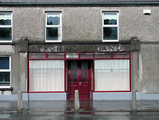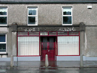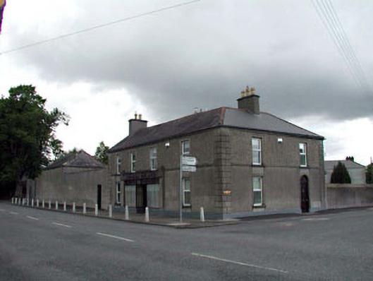 Detached four-bay two-storey house, c.1860, on a corner site with render shopfront to ground floor and two-bay two-storey side elevation to south-east having round-headed door opening to right ground floor. Refenestrated, c.1990. Now disused to ground floor. Hipped and gable-ended roof on an L-shaped plan with slate. Red clay ridge tiles. Rendered chimney stacks. Rendered coping to gables. Cast-iron rainwater goods on rendered eaves course. Rendered walls to ground floor. Unpainted. Moulded rendered string/sill course to first floor. Roughcast walls to first floor. Unpainted. Channelled piers to corner and to ends. Replacement render, c.1990, to rear elevation to north-east. Ruled and lined. Unpainted. Square-headed window openings. Stone sills (forming part of continuous sill course to first floor). Rendered surrounds. Replacement uPVC casement windows. Round-headed door opening. Rendered surround. Replacement timber panelled door, c.1990. Spoked fanlight. Rendered shopfront to ground floor with panelled pilasters, fixed-pane display windows, glazed timber panelled doors and render fascia over having raised lettering, consoles and moulded cornice. Road fronted on a corner site. Concrete footpath to front. Detached three-bay two-storey outbuilding, c.1860, to north-west. Hipped roof with slate (lean-to section to north-east possibly a later alteration). Clay ridge tiles. Cast-iron rainwater goods. Roughcast walls to road front (south-west) elevation. Unpainted. Rubble stone walls to remainder. Openings and fittings not visible.
