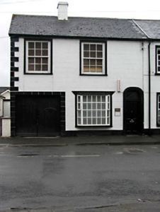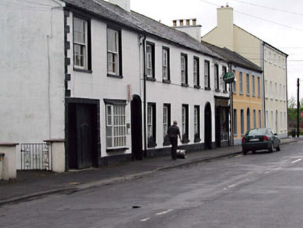 End-of-terrace three-bay two-storey house, c.1850, originally part of five-bay composition with building to north-west retaining original fenestration to first floor with round-headed door opening to right ground floor and square-headed integral carriageway to left ground floor. Extensively renovated, c.1980, with window opening remodelled to ground floor to accommodate part use as offices. Originally one of a pair. Gable-ended roof. Replacement artificial slate. Concrete ridge tiles. Rendered chimney stack. Cast-iron rainwater goods on eaves course. Rendered walls. Ruled and lined. Painted. Rendered quoins to corner (south-east). Square-headed window openings (remodelled, c.1980, to ground floor. Stone sills (concrete, c.1980, to ground floor). Moulded rendered surrounds. Original 6/6 timber sash windows to first floor with exposed sash boxes (replacement timber casement window, c.1980, to ground floor). Round-headed door opening. Moulded rendered surround. Timber panelled door. Oval overlight. Square-headed integral carriageway. Rendered channelled surround. Timber boarded double doors. Road fronted. Concrete footpath to front.