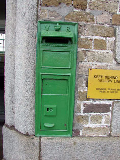 Wall-mounted cast-iron post box, c.1890, with raised "VR" royal cipher and crown motif. Mounted in wall of Kildare Railway Station.