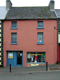 Terraced two-bay three-storey house, c.1830. Refenestrated, c.1900. Reroofed and renovated, c.1970, with openings remodelled to ground floor to accommodate commercial use. One of a pair. Gable-ended roof. Replacement artificial slate, c.1970. Concrete ridge tiles. Rendered chimney stacks. Cast-iron rainwater goods. Rendered walls. Painted. Square-headed openings (remodelled, c.1970, to ground floor). Stone sills (concrete to ground floor). Replacement 1/1 timber sash windows, c.1900, to upper floors. Replacement timber fixed-pane display window, c.1970, to right ground floor. Replacement glazed timber doors, c.1970, to left ground floor. Road fronted. Concrete brick cobbled footpath to front.