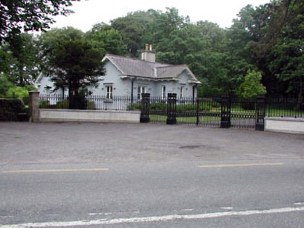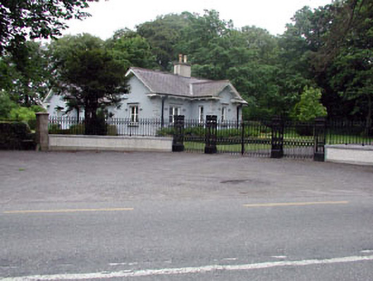 Gateway, c.1900, comprising four decorative cast-iron open work piers with castellated coping having cast-iron double gates, cast-iron flanking pedestrian gates, curved flanking walls with cast-iron railings over and cut-stone outer piers with chamfered corners and pyramidal capping.