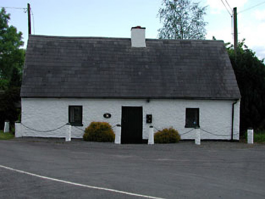 Detached three-bay single-storey cottage, c.1750, probably originally thatched. Reroofed, c.1970. Refenestrated, c.1990. Gable-ended roof. Replacement artificial slate, c.1970. Concrete ridge tiles. Rendered chimney stack. Replacement uPVC rainwater goods, c.1990, on rendered eaves course. Roughcast walls (probably replacement). Square-headed openings. Stone sills. Replacement timber casement windows, c.1990. Replacement tongue-and-groove timber panelled door, c.1990. Road fronted on a wedge-shaped site.