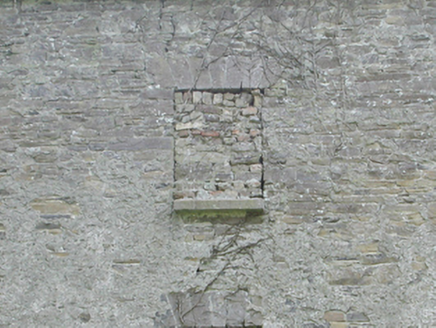 Detached five-bay four-storey mill, extant 1837, on a rectangular plan. Now disused. Hipped gabled slate roof with clay ridge tiles, and no rainwater goods surviving on cut-limestone eaves. Lime rendered or roughcast coursed rubble stone battered walls with concealed flush quoins to corners. Square-headed window openings with cut-limestone sills, and concealed dressings including cut-limestone voussoirs framing remains of timber fittings. Set in unkempt grounds.