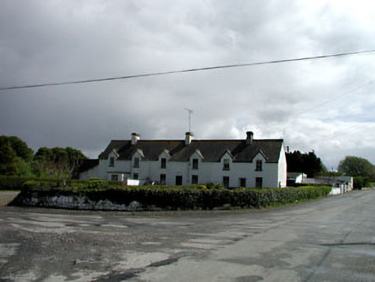 Group of three terraced three-bay single-storey houses with half-dormer attics, c.1900, on a corner site with one retaining original aspect. House to left (east) renovated, c.1970, with single-bay single-storey flat-roofed advanced porch added to centre. House to centre refenestrated, c.1980. Gable-ended roof (shared) with slate (gabled to half-dormer attic windows). Clay ridge tiles (crested to half-dormer attic windows). Rendered chimney stacks. Timber eaves and bargeboards. Cast-iron rainwater goods. Flat-roofed to porch to left (east). Bitumen felt. Timber eaves. Roughcast walls. Painted. Square-headed window openings. Stone sills. Original 2/2 timber sash windows (replacement timber casement windows, c.1980, to house to centre). Replacement timber panelled and glazed timber panelled doors, c.1970-c.1980. Set back from line of road in own grounds on a corner site. Landscaped forecourts to front. Rubble stone boundary wall to front and to side (west).