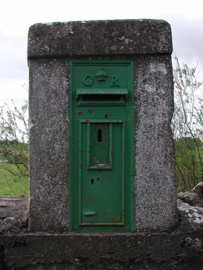 Pier-mounted cast-iron "wall box" post box, extant 1922, with "GR [Georgius Rex]" royal cipher. Set in rendered pier.
