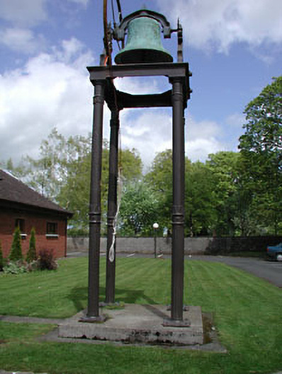 Freestanding cast-iron belfry, erected c.1880, comprising four pillars with fluting, acanthus leaf motif and foliate decoration having bell over.