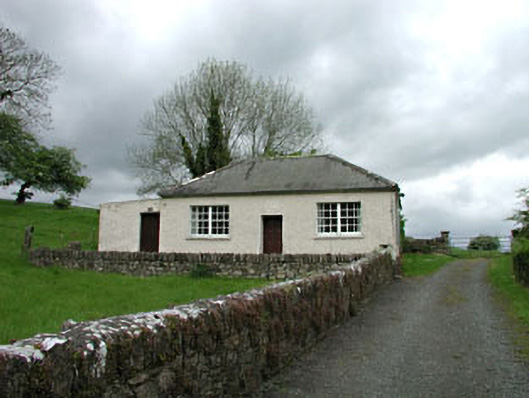 Detached three-bay single-storey former school, c.1930, retaining early fenestration. Extended, c.1950, comprising single-bay single-storey lean-to end bay to left (west). Hipped roof with slate (lean-to to end bay). Clay ridge tiles. Aluminium rainwater goods on eaves course. Roughcast walls. Painted. Square-headed window openings. Concrete sills. Original 6/6 bipartite timber sash windows. Square-headed door openings. Timber panelled doors. Road fronted perpendicular to road with side (east) elevation fronting on to road. Rubble stone boundary wall to site.