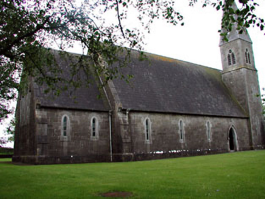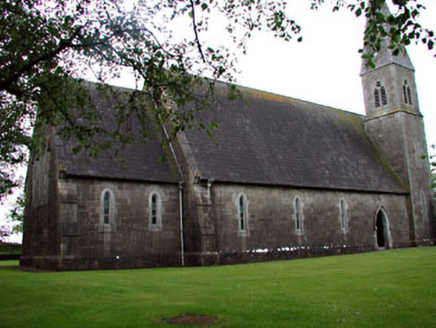 Detached seven-bay double-height Gothic-style Catholic church, built 1860-3, comprising five-bay double-height nave with lancet-arch openings, single-bay three-stage engaged corner tower to west on a square-plan with spire and two-bay double-height lower chancel to north-east gable end having single-bay single-storey sacristy projection to north-west. Gable-ended roof with slate (gabled to sacristy projection). Clay ridge tiles. Cut-stone coping to gables with trefoil motif. Cut-stone chimney stack to gable to sacristy projection. Cast-iron rainwater goods with decorative hoppers. Pyramidal roof to spire with slate (fish-scale pattern). Hammer-dressed snecked limestone walls. Stepped buttresses to corners. Lancet-arch window openings (paired to south-west gable end; tripartite to north-east gable end with hood moulding over). Cut-stone chamfered block-and-start surrounds. Fixed-pane leaded windows. Lancet-arch openings to tower. Louvered timber panels to top stage. Pointed-arch door opening. Cut-stone chamfered surround. Hood moulding over. Timber panelled doors. Full-height interior open into roof. Glazed timber panelled internal porch. Exposed timber roof construction on cut-stone corbels. Gothic style altar and reredos to chancel. Set back from road in own grounds. Lawns to site. Rubble stone boundary wall to site.