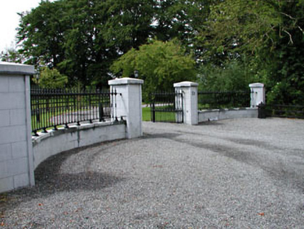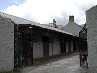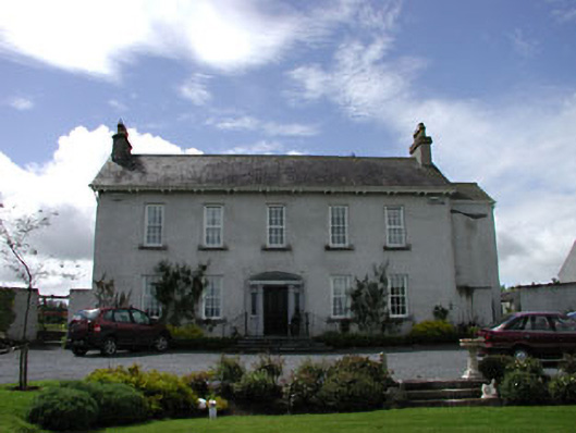 Detached five-bay two-storey house, c.1860, possibly over basement with segmental-headed door opening to centre, single-bay two-storey recessed lower end bay to right (east) and five-bay two-storey parallel range along rear elevation to north having single-bay single-storey canted bay window to east and single-bay two-storey return to rear to north. Extended, c.1995, comprising single-bay single-storey flat-roofed return to rear to north with balcony over and single-bay single-storey conservatory. Gable-ended roofs with slate (pyramidal to conservatory). Clay ridge tiles. Rendered chimney stacks. Overhanging timber eaves on paired brackets. Cast-iron rainwater goods. Roughcast walls. Unpainted. Square-headed window openings (including to canted bay window to east to parallel range). Stone sills. Replacement 6/6 timber sash windows, c.1995, with exposed sash boxes (some possibly original). Segmental-headed door opening. Cut-stone Ionic doorcase approached by flight of stone steps. Timber panelled door. Sidelights and spiders-web fanlight. Set back from road in own grounds. Gravel forecourt to front. Mature landscaped gardens to rear. Detached five-bay single-storey outbuilding, c.1860, to east. Reroofed, c.1970. Gable-ended roof. Replacement corrugated-iron, c.1970. Iron ridge tiles. Cast-iron rainwater goods on eaves course. Roughcast walls. Unpainted. Square-headed door openings. Timber panelled half doors. Gateway, c.1860, to south comprising four cut-stone piers with curved flanking walls having cast-iron gates and railings.
