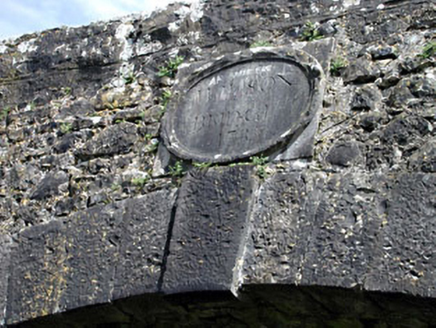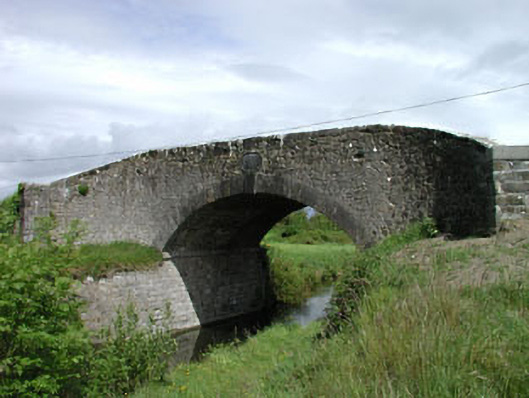 Single-arch rubble stone hump back road bridge over canal, dated 1785, with dressed stone voussoirs, cut-stone stringcourse and rubble stone parapet walls having cut-stone date stone/plaque. Coursed dressed stone walls to abutments. Cut-stone piers. Rubble stone parapet walls. Cut-stone date stone/plaque. Single elliptical arch. Dressed stone voussoirs with cut-stone keystone. Squared rubble stone soffits with traces of render over. Sited spanning Grand Canal (Athy Branch) with tow path to east and grass banks to canal.