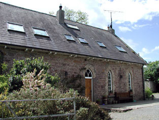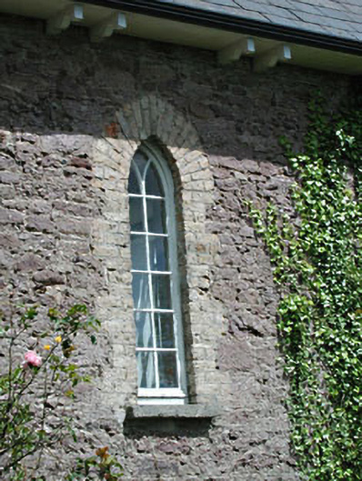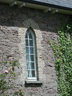 Detached five-bay single-storey national school with dormer attic, built 1891, on a rectangular plan. Renovated, 1989, to accommodate alternative use. Replacement pitched slate roof with roll moulded ridge tiles, concrete coping to gables with rendered dwarf chimney stacks to apexes having rendered capping supporting yellow terracotta octagonal pots, rooflights, and uPVC rainwater goods on timber eaves having paired timber consoles. Part repointed rubble stone walls with rough cut rubble stone flush quoins to corners. Pointed-arch central door opening with repointed yellow brick voussoirs framing diagonal timber boarded door having overlight. Lancet window openings with cut-granite sills, and repointed yellow brick block-and-start surrounds framing timber casement windows having Y-tracery glazing bars. Pointed-arch window openings (side elevations) with cut-granite sills, and repointed yellow brick block-and-start surrounds framing timber casement windows having interlocking Y-tracery glazing bars. Lancet flanking window openings with cut-granite sills, and repointed yellow brick block-and-start surrounds framing timber casement windows having Y-tracery glazing bars. Set back from line of road with rendered cylindrical piers to perimeter having cut-granite shallow conical capping supporting spear head-detailed iron gate.