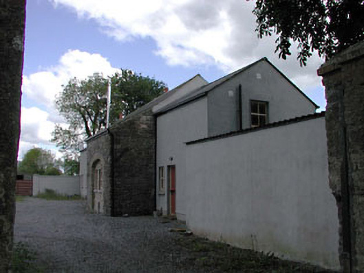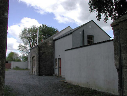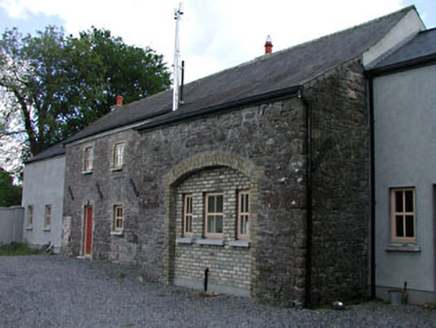 Detached three-bay two-storey Board of First Fruits Church of Ireland glebe house, built 1808, on a cruciform plan centred on single-bay two-storey projecting breakfront; single-bay (single-bay deep) two-storey lower central return abutting single-bay (two- or three-bay deep) two-storey lower return (east). Pitched slate roof centred on hipped slate roof (breakfront); pitched slate roof (east), ridge tiles, rendered chimney stacks on axis with ridge having capping supporting terracotta tapered pots, and replacement uPVC rainwater goods on rendered eaves. Replacement cement rendered walls on chamfered plinth. Remodelled round-headed central door opening with two cut-limestone steps, and concealed dressings framing timber panelled door having fanlight. Round-headed window openings (ground floor) with dragged cut-limestone sills, and concealed dressings framing replacement six-over-six timber sash windows having fanlights. Square-headed window openings (first floor) with dragged cut-limestone sills, and concealed dressings framing replacement three-over-six timber sash windows. Set in landscaped grounds with rendered piers to perimeter having margined rock faced cut-limestone capping.