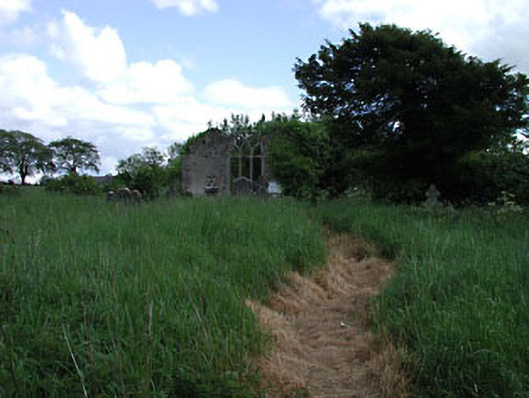 Graveyard with various cut-stone grave markers, c.1810-c.1910. Now overgrown. Remains of detached rubble stone single-cell Catholic chapel, c.1810, comprising west gable with lancet-arch traceried window opening. Now in ruins. Gateway, c.1810, to site comprising pair of cut-stone circular piers with iron double gates having rubble stone flanking boundary wall.