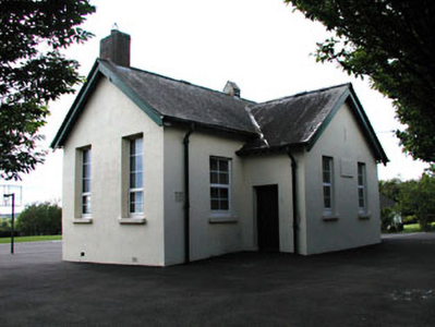 Detached four-bay single-storey national school, dated 1926, on a T-shaped plan with two-bay single-storey gabled projecting entrance bay to centre. Reroofed, c.1980. Refenestrated, c.1995. Gable-ended roof (gabled to projecting entrance bay). Replacement fibre-cement slate, c.1980. Concrete ridge tiles. Red brick chimney stacks. Louvered vent to apex. Overhanging timber eaves and bargeboards. Replacement aluminium rainwater goods, c.1980. Rendered walls. Painted. Cut-stone date stone/plaque. Square-headed window openings. Concrete sills. Replacement uPVC casement windows, c.1995. Square-headed door opening. Timber panelled door. Set back from road in own grounds. Tarmacadam yard to site.