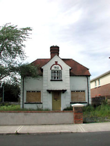 Detached three-bay single-storey house with half-dormer attic, dated 1912, with single-bay two-storey gabled projecting entrance bay to centre. Extended, c.1965, comprising single-bay single-storey flat-roofed return to rear to north with single-bay single-storey box bay window to west. Now disused. Hipped gabled roof with red clay tiles (gabled to entrance bay). Red clay ridge tiles. Red brick chimney stack. Overhanging timber eaves. Cast-iron rainwater goods on timber brackets. Flat-roof to return. Bitumen felt. Hipped to box bay window. Artificial slate. Rendered walls. Painted. Raised rendered quoin strips to corners. Rendered date stone to entrance bay with raised figures. Square-headed window openings (including to box bay window). Stone sills. Moulded rendered architraves. Moulded rendered hood moulding and keystone to window opening to first floor entrance bay. Timber casement windows (paired to entrance bay; tripartite to flanking bays) (now mostly boarded up). Square-headed door opening. Concrete canopy over on modillion consoles. Glazed timber panelled door. Set back from road in own part overgrown grounds.