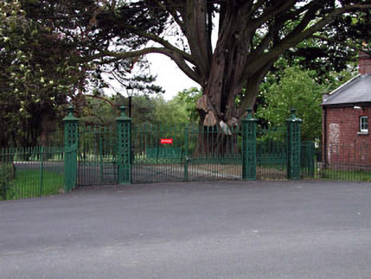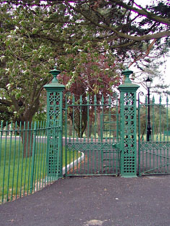 Gateway, c.1870, comprising four open work cast-iron piers with cast-iron double gates and flanking pedestrian gates having urn and trefoil motifs. One of a number of identical gateways - original and modern replica - throughout The Curragh Camp.