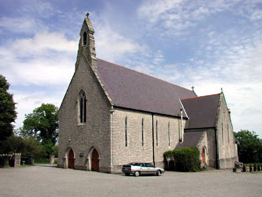 Detached six-bay double-height limestone-built Gothic Revival Catholic church, dated 1858, on a cruciform plan comprising four-bay double-height nave with lancet-arch opening, single-bay double-height transepts to north-east and to south-west, single-bay single-storey lean-to porch to north and single-bay double-height chancel to south-east having single-bay single-storey lean-to sacristy projection to south, and bellcote over gable to entrance bay to north-west gable end. Gable-ended roofs on a cruciform plan with slate (lean-to to porch and to sacristy projection). Red clay ridge tiles. Cut-stone coping to gables with cross finials. Cut-stone bellcote to gable to north-west. Cast-iron and aluminium rainwater goods on trefoil brackets. Rock-faced snecked limestone walls. Stepped buttresses. Cut-stone stoup. Lancet-arch window openings (paired to transepts; traceried to north-west (two-light) and to south-east (five-light) with quatrefoils and hood mouldings over). Cut-limestone chamfered sills and surrounds. Fixed-pane leaded stained glass windows. Pointed-arch door openings (paired to north-west). Cut-stone chamfered doorcases with hood mouldings over. Tongue-and-groove timber panelled double doors with wrought iron hinges. Full-height interior open into roof. Timber pews. Cut-stone wall monuments/memorials. Gothic-style reredos to chancel. Exposed timber roof construction on cut-stone corbels. Set back from road in own grounds. Gravel forecourt to front. Pair of cut-stone Celtic cross-style grave markers, c.1900, to north. Burial plot, dated 1928, to south-east with cut-stone grave marker and section of cast-iron railings.