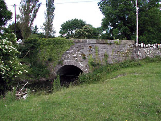 Single-arch cut-stone road bridge over river, dated 1876, with rock-faced voussoirs and cut-stone parapet walls having cut-stone date stone/plaque and dressed stone coping. Coursed rock-faced cut-stone walls to abutments. Coursed rock-faced cut-stone parapet walls. Cut-stone date stone/plaque. Dressed stone coping. Single round arch. Rock-faced voussoirs. Squared rubble stone soffits with traces of render over. Sited spanning stream with grass banks to stream.