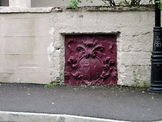 Wall-mounted cast-iron armorial plaque, c.1880, with inscribed armorial motifs having cartouche surround. Set in boundary wall at side of road.