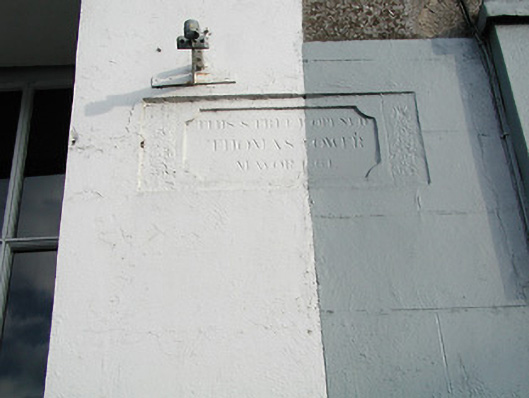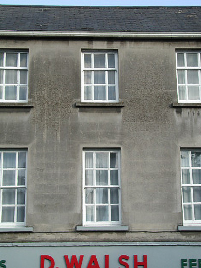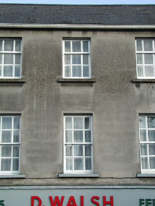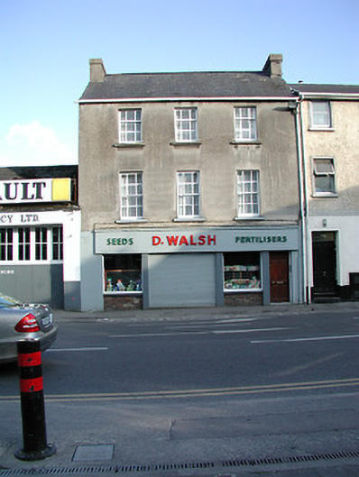 Terraced three-bay three-storey house, c.1800. Renovated, c.1975, with openings to ground floor remodelled to accommodate commercial use. Pitched slate roof with clay ridge tiles, rendered chimney stacks, and replacement uPVC rainwater goods on rendered eaves. Unpainted rendered, ruled and lined walls with shared cut-stone panelled date stone/plaque. Square-headed window openings with cut-stone sills, six-over-six (first floor) and three-over-six (top floor) timber sash windows. Square-headed openings to ground floor remodelled, c.1975, forming commercial frontage with fixed-pane timber display windows on stone-clad stall risers, glazed timber panelled doors, and fascia having raised lettering with rendered coping over. Road fronted with concrete footpath to front.