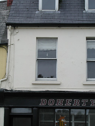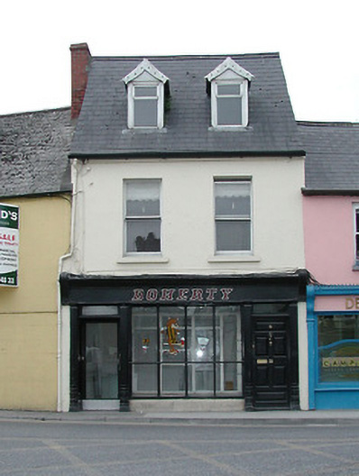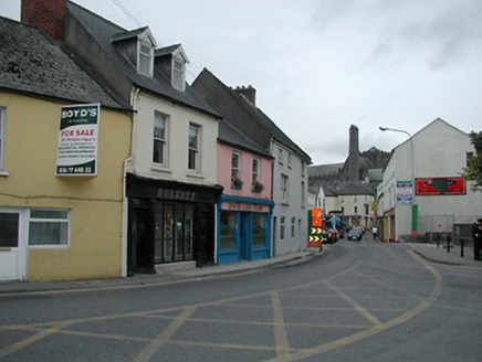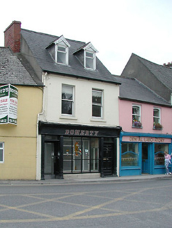 Terraced two-bay two-storey house with dormer attic, c.1875, with shopfront to ground floor. Reroofed and part refenestrated. Now disused to ground floor. Pitched roof (gabled to dormer attic windows) with replacement artificial slate, clay ridge tiles, red brick Running bond chimney stack, pierced bargeboards to gables, and iron rainwater goods on rendered eaves having iron brackets. Painted rendered, ruled and lined walls. Square-headed window openings with cut-stone sills, and one-over-one timber sash windows having replacement uPVC casement windows to dormer attic. Timber shopfront to ground floor on a symmetrical plan with fluted engaged columns, fixed-pane (four-light) display window having glazed timber screen behind, glazed timber door having overlight, timber panelled door to house having overlight, fascia with fluted consoles, and moulded cornice. Road fronted with concrete footpath to front.