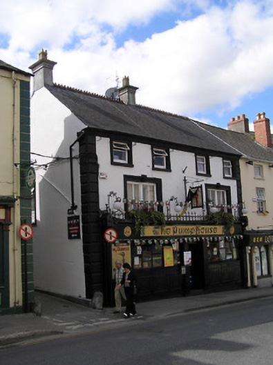 End-of-terrace four-bay three-storey house, c.1825, possibly originally two separate two-bay three-storey houses. Renovated, c.1900, with pubfront inserted to ground floor. Part refenestrated, c.1975. Pitched slate roof with decorative terracotta ridge tiles, rendered chimney stacks, and cast-iron rainwater goods on moulded rendered eaves. Painted rendered walls with rendered channelled piers to ends having vermiculated panels. Square-headed window openings (in bipartite arrangement to first floor) with cut-stone sills, moulded rendered surrounds having keystones to first floor, and two-over-two timber sash windows having replacement timber casement windows, c.1975, to top floor. Pubfront, c.1900, to ground floor with fixed-pane timber windows on panelled stall risers, timber panelled double doors, fascia over having decorative consoles, moulded cornice, and iron cresting. Road fronted with concrete footpath to front having rounded cut-stone wheelguard to corner.