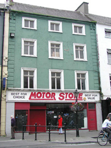 Terraced three-bay four-storey house, c.1800. Extensively renovated, c.1950, with shopfront inserted to ground floor. Now disused. One of a pair. Pitched (shared) slate roof with clay ridge tiles, red brick Running bond chimney stack, rendered coping, and cast-iron rainwater goods on rendered eaves. Painted rendered walls with rendered channelled piers to ends having paired consoles supporting eaves. Square-headed window openings with cut-stone sills, moulded rendered surrounds, and replacement timber casement windows, c.1950. Shopfront, c.1950, to ground floor with textured concrete piers, fixed-pane display windows, timber panelled double doors having overlight, timber panelled door to house having overlight, and fascia. Road fronted with concrete brick cobbled footpath to front.