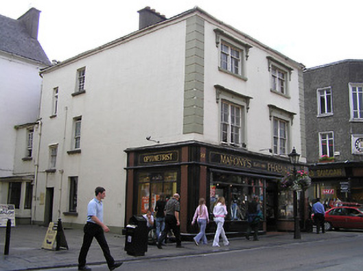 Attached two-bay three-storey house, c.1825, on a corner site. Renovated with replacement shopfront inserted to ground floor. Hipped slate roof with clay ridge tiles, rendered chimney stack on axis with ridge, slightly sproketed eaves, and cast-iron rainwater goods on moulded rendered eaves. Painted rendered, ruled and lined walls with rendered channelled piers to ends. Square-headed window openings in bipartite arrangement with cut-stone sills, rendered surrounds having entablatures over on consoles, four-over-four (first floor) and two-over-four (top floor) timber sash windows. Replacement Kilkenny marble-clad shopfront to ground floor with polished pink granite tapered pilasters, fixed-pane display windows, mosaic-tiled threshold, glazed timber door having overlight, inscribed fascia, and moulded cornice. Interior with timber panelled shutters to window openings. Road fronted on a corner site with concrete brick cobbled footpath to front.
