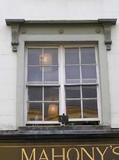 A well-composed middle-size house occupying a prominent corner site in the centre of Kilkenny, thereby contributing positively to the visual appeal of the streetscape. Various attributes including the bipartite arrangement to the window openings, the fine rendered accents, and so on all serve to enhance the architectural design value of the composition while the retention of most of the historic fabric to the upper floors both to the exterior and to the interior augments the character of the site.