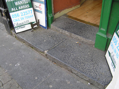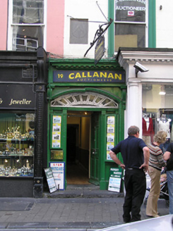 Terraced two-bay four-storey house, c.1825, incorporating fabric of medieval building, 1582/4, on site. Extensively renovated, c.1900, with advanced shopfront inserted to ground floor. Now in use as offices to upper floors. One of a pair. Pitched (shared) slate roof with clay ridge tiles, rendered chimney stacks, and cast-iron rainwater goods on overhanging rendered eaves having iron braces. Painted rendered, ruled and lined walls with cut-limestone date stone/plaque to first floor. Square-headed window openings with cut-stone sills, moulded rendered surrounds, replacement one-over-one (first floor) and two-over-two (remainder) timber sash windows, c.1900. Segmental-headed door opening with two tooled cut-limestone steps having cast-iron bootscraper, timber pilaster doorcase, timber panelled door having sidelights, fanlight, and consoles supporting fascia over having dentilated moulded cornice. Advanced timber shopfront, c.1900, to ground floor on a symmetrical plan with fluted/reeded engaged Doric columns, panelled pilasters having consoles, fixed-pane display windows, glazed timber panelled double door having overlight, and fascia with dentilated moulded cornice. Interior with timber panelled shutters to window openings. Road fronted with concrete brick cobbled footpath to front.