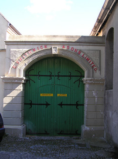 Gateway, c.1875, comprising segmental-headed carriageway with pair of painted rusticated rendered piers having dentilated moulded cornices, tongue-and-groove timber panelled double doors (incorporating double doors to wicket gate) with decorative wrought iron hinges, moulded archivolt having keystone, raised lettering, tooled rendered panels, and moulded cornice to parapet having blocking course over. Lane fronted.
