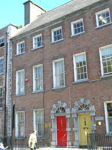 Terraced three-bay three-storey over basement red brick house, c.1775. Now in use as offices. One of a pair. Pitched (shared) slate roof with clay ridge tiles, rendered chimney stack, rendered coping, and cast-iron rainwater goods on moulded cut-limestone eaves having iron brackets. Red brick Flemish bond walls with cut-limestone dressings including chamfered course to ground floor, quoins to ends, moulded course to eaves, and random rubble stone wall to rear (east) elevation. Square-headed window openings with cut-stone sills, red brick voussoirs (red brick dressings to rear (east) elevation), six-over-six and three-over-three (top floor) timber sash windows. Round-headed door opening with three cut-limestone steps, cut-limestone Gibbsian surround, and timber panelled door having fanlight. Interior with timber panelled shutters to window openings. Road fronted with sections of wrought iron railings to front on cut-limestone plinth.