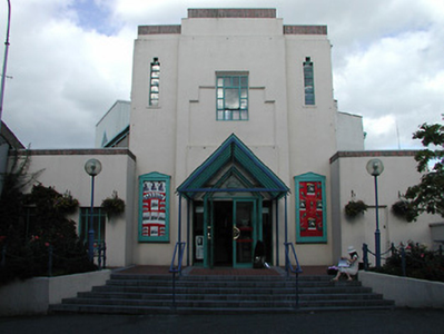 Attached single-bay double-height cinema, pre-1945, on a cranked plan with three-bay double-height entrance bay to west having single-bay full-height breakfront, and single-bay single-storey flat-roofed advanced flanking end bays. Renovated and extended, 1993, comprising single-bay double-height flat-roofed stage house to east with single-bay single-storey gabled projecting glazed porch added to breakfront to accommodate use as theatre. Roofs not visible behind parapets with concealed cast-iron rainwater goods. Flat roof to stage house not visible. Pitched (gabled) glazed roof to porch in iron frame on iron colonettes. Painted rendered walls with crow-stepped gables to main (auditorium) block and to entrance bay having red brick soldier course parapets to entrance bay, and red brick soldier course parapets to advanced flanking end bays. Painted corrugated-iron-clad walls to stage house. Square-headed window opening to breakfront in crow-stepped recess with profiled window openings to flanking bays having rendered surrounds, square-headed window openings to remainder with concrete sills, and fixed-pane timber windows to all window openings having casement section to breakfront. Square-headed openings to porch with glazed double doors having fixed-pane flanking lights. Set back from line of road on a slightly elevated site with flight of six cut-limestone steps leading to red brick cobbled forecourt.
