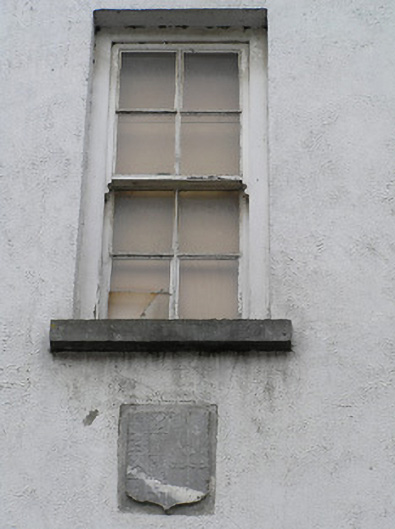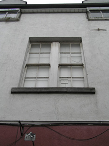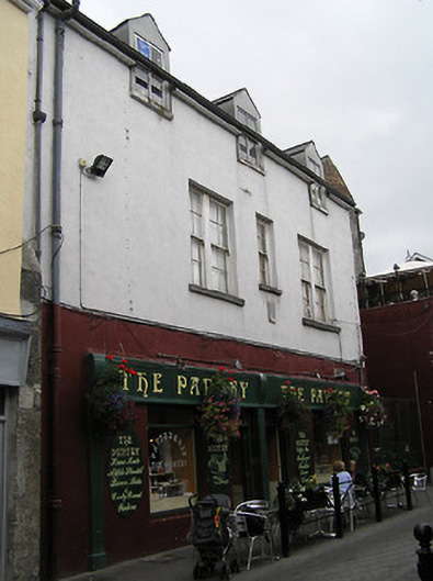 Attached three-bay two-storey house with half-dormer attic, c.1600. Extensively renovated, 1854. Renovated, c.1925. Extensively renovated with openings to ground floor remodelled to accommodate commercial use. Pitched roof (gabled to half-dormer attic windows) with replacement artificial slate, clay ridge tiles, and replacement uPVC rainwater goods on replacement timber eaves. Painted replacement rendered walls with cut-limestone shield plaque to first floor. Square-headed window openings (in bipartite arrangement to outer bays to first floor) with cut-stone sills, and four-over-four timber sash windows having replacement uPVC casement windows to half-dormer attic. Square-headed openings to ground floor remodelled with fixed-pane timber windows, timber panelled doors having overlights, and pair of timber shopfronts with fluted pilasters supporting fascias having fluted consoles. Road fronted.