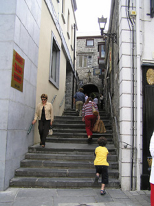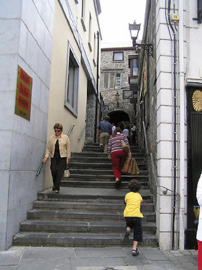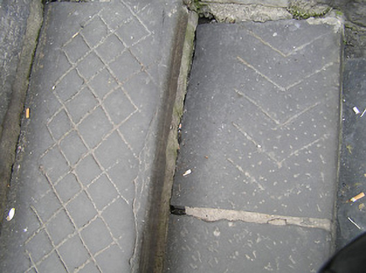 An attractive feature in the townscape of Kilkenny having origins in an early seventeenth-century covered alley established by Nicholas Langton (n. d.) to link High Street with Saint Kieran's Street (then known as Low Lane). Employing locally-sourced limestone the steps are imbued with a picturesque quality lacking in modern methods of paving roads and streets while the inscribed patterns introduce an element of some artistic design merit to the site.