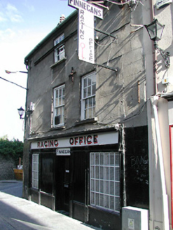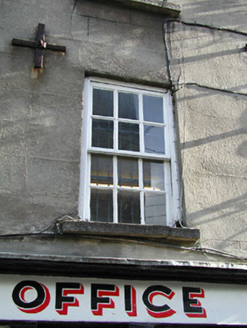 Terraced two-bay three-storey house, extant 1839, on a cranked L-shaped plan with shopfront to ground floor; two-bay two-storey side (north-east) elevation. Pitched fibre-cement slate roof on a cranked L-shaped plan with terracotta ridge tiles, rendered, ruled and lined chimney stack having concrete capping supporting louvered yellow terracotta pot, and cast-iron rainwater goods on rendered eaves with cast-iron octagonal hopper and downpipe. Braced rendered, ruled and lined walls. Timber shopfront to ground floor on a symmetrical plan centred on glazed timber panelled double doors. Square-headed window openings (upper floors) with concrete sills, and concealed dressings framing six-over-six (first floor) or three-over-six (top floor) timber sash windows without horns. Square-headed window openings (north-east) with concrete sills, and concealed dressings framing six-over-six (first floor) or three-over-six (top floor) timber sash windows without horns. Lane fronted on a corner site.