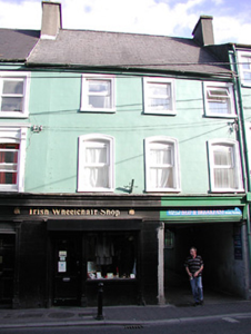 Terraced three-bay three-storey house, c.1750, with square-headed carriageway to right ground floor. Renovated, c.1875, with overlapping shopfront inserted to ground floor. Extensively renovated. Now in use as guesthouse to upper floors. Pitched roof with replacement artificial slate, clay ridge tiles, rendered (shared) chimney stack, and cast-iron rainwater goods on rendered eaves. Painted rendered, ruled and lined walls. Square-headed window openings (in camber-headed recesses to first floor) with cut-stone sills, moulded rendered surrounds, and replacement uPVC casement windows. Timber shopfront, c.1875, to ground floor (overlapping house to east) incorporating square-headed carriageway to right ground floor with panelled pilasters, fixed-pane timber window, glazed timber door, timber panelled door to house having overlight, wrought iron double gates to carriageway, fascia having consoles, and moulded cornice. Road fronted with concrete cobbled footpath to front.