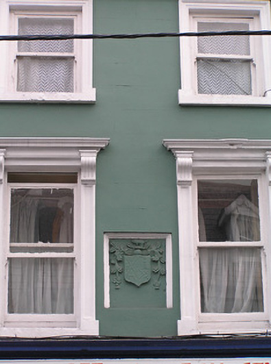 Terraced three-bay three-storey house with dormer attic, c.1750, incorporating fabric of earlier house, 1638, on site. Extensively renovated, c.1900. Renovated, c.1975, with replacement shopfront inserted to ground floor incorporating fabric of earlier shopfront, c.1900. Renovated. Pitched roof with replacement artificial slate, clay ridge tiles, rendered (shared) chimney stack, rooflight, and cast-iron rainwater goods on rendered eaves. Painted rendered, ruled and lined walls with cut-stone date stone to first floor having chamfered surround. Square-headed window openings with cut-stone sills, moulded rendered surrounds having consoles to first floor supporting entablatures, and replacement one-over-one timber sash windows, c.1900, having replacement uPVC casement windows to rear (south) elevation. Replacement timber shopfront, c.1975, to ground floor incorporating fabric of earlier shopfront, c.1900, with pilasters, fixed-pane (two-light) timber window, glazed timber panelled door, timber panelled door to house having overlight, replacement fascia over having console, and moulded cornice. Road fronted with concrete brick cobbled footpath to front.
