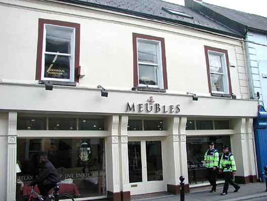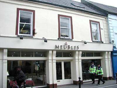 Terraced four-bay two-storey house with dormer attic, c.1900, with square-headed carriageway to left ground floor. Extensively renovated with replacement shopfront inserted to ground floor and dormer attic added. Pitched roof with replacement artificial slate, clay ridge tiles, rendered chimney stacks, rooflights, and replacement uPVC rainwater goods on moulded rendered eaves retaining cast-iron downpipe. Painted rendered, ruled and lined wall with rendered channelled piers to ends, and rendered band to eaves continuing into moulded cornice. Square-headed window openings with cut-stone sills, and one-over-one timber sash windows. Replacement timber shopfront to ground floor (incorporating square-headed carriageway to left) with paired fluted pilasters having consoles, fixed-pane timber display windows, glazed timber double doors having overlight, and fascia over. Interior with timber panelled shutters to window openings. Road fronted with concrete brick cobbled footpath to front.