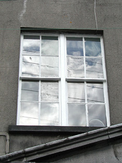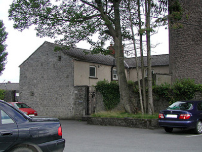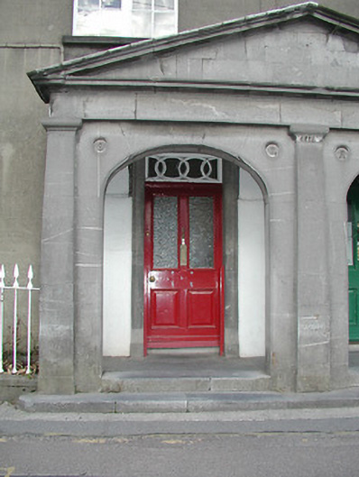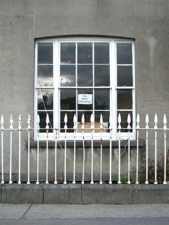 Semi-detached two-bay three-storey house, built 1832, with shared single-bay single-storey pedimented projecting open porch to right ground floor, and single-bay three-storey shallow return to east. Reroofed, c.1925. Now in use as offices. One of a pair. Pitched (shared) roof part behind parapet (hipped to return; gabled (shared) to porch) with replacement artificial slate, c.1925, clay ridge tiles, red brick Running bond chimney stack, and cast-iron rainwater goods on rendered eaves. Unpainted rendered, ruled and lined walls with cut-limestone stepped parapet having bas-relief panel, limestone ashlar walls to porch having tapered pilasters supporting frieze, and moulded surround to shared pediment. Camber-headed window opening to ground floor in tripartite arrangement with square-headed window openings to remainder (in bipartite arrangement to first floor; round-headed window opening to return) having cut-stone sills, six-over-six timber sash window to tripartite opening having two-over-two sidelights, four-over-four timber sash windows to bipartite openings, and two-over-two timber sash windows to remainder. Elliptical-headed opening to open porch with cut-limestone step, chamfered reveals, and no fittings. Square-headed door opening to house with carved cut-limestone architrave, and glazed timber panelled door having overlight. Interior with timber panelled shutters to window openings. Road fronted with sections of iron railings to front on limestone ashlar plinth having foliate finials. (ii) Attached three-bay two-storey coach house, built 1832, to east on an L-shaped plan with single-bay two-storey linking bay to west. Reroofed, c.1925. One of a pair. Pitched (shared) roof on an L-shaped plan with replacement artificial slate, c.1925, clay ridge tiles, red brick Running bond (shared) chimney stack, rooflights, pre-2001, and iron rainwater goods on cut-stone eaves. Painted roughcast walls with exposed random rubble stone construction to side (north) elevation. Square-headed window openings in camber-headed recesses with cut-stone sills, and three-over-three timber sash windows having some timber casement windows.