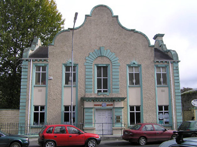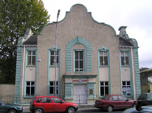 Detached five-bay two-storey hall, built 1914, on a H-shaped plan with three-bay two-storey curvilinear gabled central bay having single-bay single-storey flat-roofed projecting porch to centre ground floor, and three-bay two-storey side elevations having single-bay two-storey curvilinear gabled advanced end bays. Refenestrated. Pitched slate roofs on a H-shaped plan (gabled to central bay) over steel construction with clay ridge tiles, rendered chimney stacks, and cast-iron rainwater goods on rendered eaves having consoles. Flat roof to porch not visible behind parapet. Painted roughcast walls with rendered channelled piers to corners, rendered coping to curvilinear gables, rendered channelled pilasters to porch having moulded cornice on consoles, and blocking course to parapet. Square-headed window openings with concrete sills, moulded rendered surrounds shared between floors (some having sun-ray details), rendered channelled surround to centre first floor having block-and-start voussoirs, and replacement uPVC casement windows. Square-headed door opening with moulded rendered surround, and replacement uPVC panelled door. Road fronted with sections of iron railings to front on rendered plinth having rendered coping.