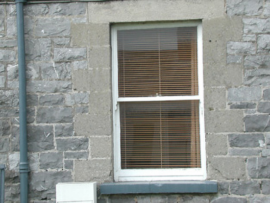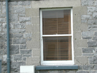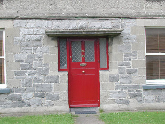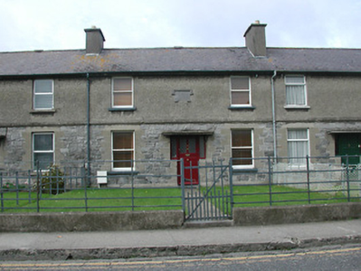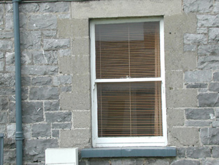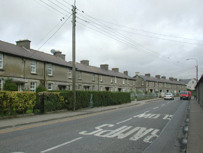 Terraced three-bay two-storey local authority house, dated 1924, on a rectangular plan. One of a terrace of four forming part of a group of sixteen. Pitched slate roof with clay ridge tiles, rendered chimney stacks having concrete capping supporting yellow terracotta pots, and cast-iron rainwater goods on rendered eaves with cast-iron downpipes. Snecked limestone wall (ground floor) on rendered plinth; roughcast surface finish (first floor) on lichen-spotted chamfered stringcourse. Hipped square-headed central door opening with step threshold, block-and-start surround with beaded canopy framing glazed timber panelled door having sidelights. Square-headed flanking window openings with sills, and block-and-start surrounds framing one-over-one timber sash windows. Square-headed window openings (first floor) with sills, and block-and-start surrounds framing one-over-one timber sash windows. Set back from street with wrought iron "estate railings" to perimeter centred on flat iron gate.